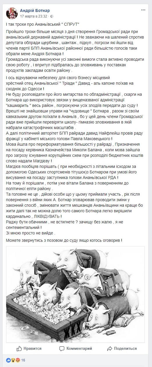 Не буду розповідати про його митарства по обладміністрації , скарги на Ботнара що використовує звязки у вищеназваної адміністрації "кашмарить " весь район , погрожуючи усіх злодіїв передати до суду !
